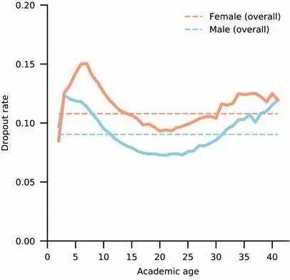 女性的科研生涯短于男性,也就意味着,女性科研人员面临比男性更高的退出风险。