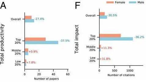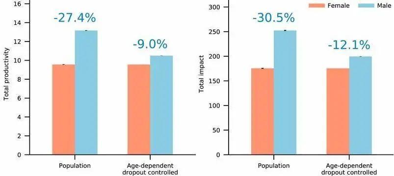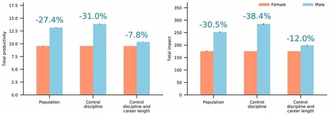 在控制了专业和职业生涯长度后,学术表现上的性别差异大幅减少,职业生涯总发文量和总引用数的性别差异减小为8%和12%。