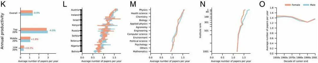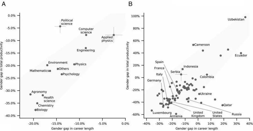 如上图所示,在男性女性的职业生涯相差较大的国家和学科中,学术产出的性别差异也往往较大,二者呈现良好的线性关系。