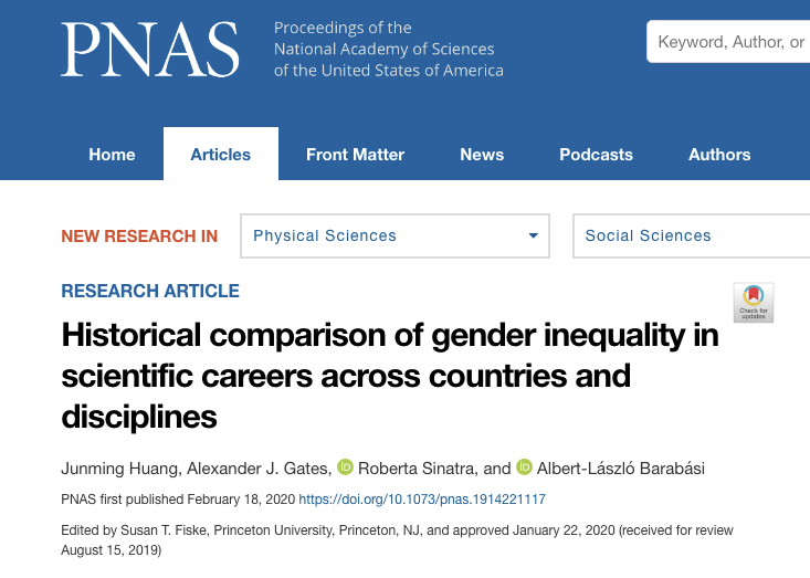 论文题目: Historical comparison of gender inequality in scientific careers across countries and disciplines 论文地址: https://www.pnas.org/content/early/2020/02/14/1914221117
