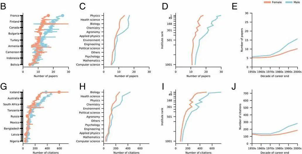 如上图所示,平均每名女性科研工作者在其整个职业生涯中发表9.6篇论文,被引用175次,而男性在这两个数据上则分别高出27%和30%。这一现象在顶尖的科学家中尤其显著:在排名前20%的科学家中,女性论文发表数量和被引量均比男性少37%左右。这样的现象在不同的国家、不同的学科、不同档次的大学甚至是不同的年代中均普遍存在。