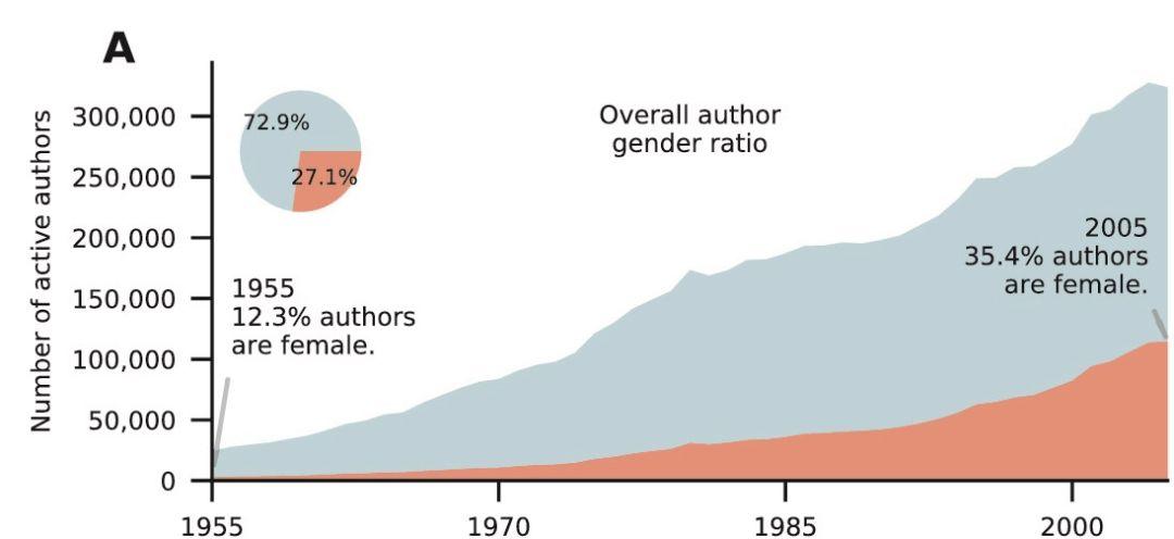 图1:自1945年起至2005年,每年发表论文的作者中女性占比从12.3%增长到了35.4%。图中饼图表示总体的女性作者比例为27.1 %