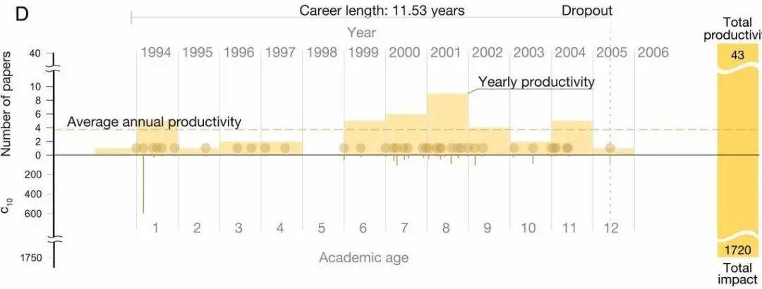 如上图所示,一个科研工作者的职业生涯表示为其发表的所有论文(实心深色黄点)的总和。发表第一篇论文标志着一个研究者进入了学术界。发表最后一篇论文被视为研究者离开科研领域(Dropout)的标志。每一篇论文的“尾巴”——黄色细实线,表示一篇论文发表后十年内的被引数据;浅黄色柱状图表示每年发表的论文数量;横贯全图的黄色虚横线则表示平均每年发表的论文数量。而右侧柱状图则表示总体的论文发表数量(上部)和被引次数(下部)。需要指出的是,根据这样的职业生涯定义来度量总发文量和总引用数,平均每名女性科研工作者的总体表现确实是低于男性的。