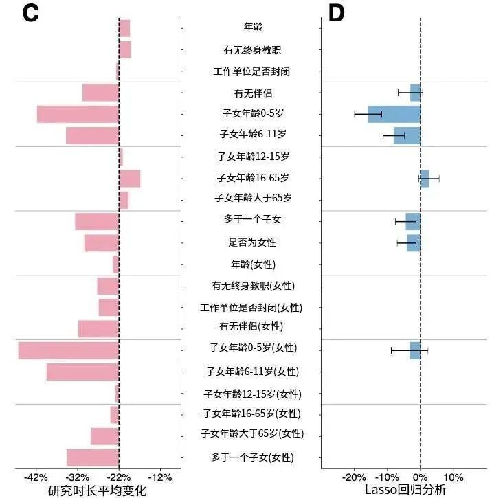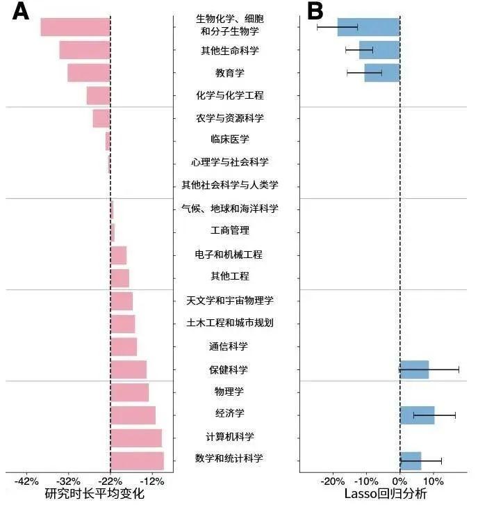 图4:依研究领域分类的工作时长变化比较与Lasso回归分析(左图中的中心虚线表示的是平均值-22%)