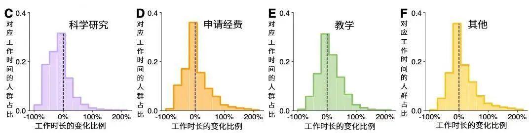 图3:依工作性质划分的工作时长变化分布情况。从左到右依次是:科学研究、申请经费、教学和其他