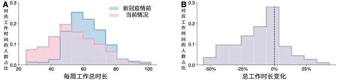 如上图左图所示,与疫情之前的每周工作时长(蓝色)相比,疫情时期人们的工作时间(红色)总体上在下降。每周平均工作时长从过去的61.4小时,降到了55.4小时。在疫情发生前,每周工作量少于42小时的科研工作者只有5.01%,而当疫情发生以后,这一部分的比例增加到了29.7%。如右图所示,尽管有超过一半的受访者表示他们的工作时长下降,但仍有27.3%的受访者表示他们的工作时长没什么变化,甚至有17.7%的受访者的工作时长增加了。
