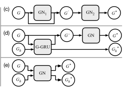 图(d)是基于递归 GN 的前向模型,该模型包含三个 RNN 子模块(gru,Cho et al.,2014))分别应用于所有边、节点和全局特征,然后再由 GN 块组成。