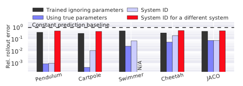 上图表明,没有系统识别模块的基线 GN 模型(黑条)表现最差。一个总是提供真实静态参数(中间蓝条)的模型,因此不需要系统辨识,表现最好。一个没有显式访问真实静态参数,但带有系统识别模块(浅蓝色条)的模型通常表现良好,有时非常接近观察到真实参数的模型。但是,当同一个模型的 ID 阶段中隐含参数与其预测阶段(红色条)不同(但来自同一分布)时,其性能与没有 ID 信息的模型(黑色)相似或更差。