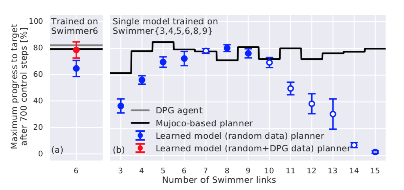 尽管 MPC 中使用的 Swimmer6 GN 模型经过训练,可以在随机动作下进行一步预测,但其游泳性能接近于使用真正的 Mujoco 物理作为模型的更复杂的规划算法,以及在系统上训练的 DDPG 代理的游泳性能(见上图中a)。当我们使用随机动作和 DDPG 代理轨迹的混合训练 GN 模型时,与 Mujoco planner 和学习的 DDPG 代理基线相比,我们的方法在性能上没有任何差异。