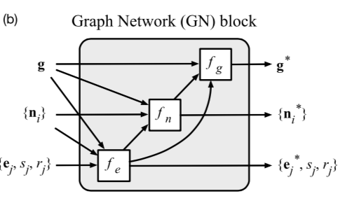 有了当前的状态和动作(动作指的就是施加在关节上的力),随着物理系统的运动,我们可以得到一个数据的序列。我们就可以用当前的状态和动作去预测未来的状态了。由于每个状态都可以表示成一个Graph,所以我们可以用一个 Graph 到Graph 的映射来完成这个预测过程,作者提出了一个基本的 Graph 到 Graph 映射组件,叫做Graph Network(GN) block,一个 GN block 接受一个 Graph,经过运算,输出一个Graph。