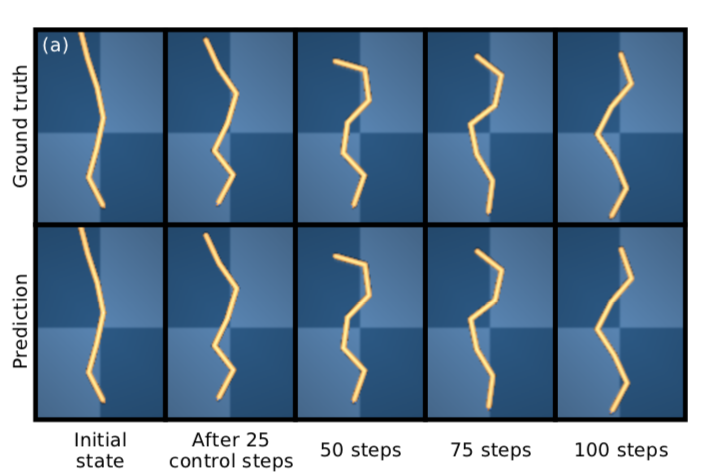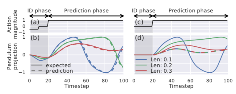 上图中是在钟摆中的系统识别分析,(a)在20步ID阶段,控制输入被应用到三个不同长度、不可观测的摆上,这使得系统可以识别。(b)在随后的 80 步预测阶段,模型的预测轨迹(虚线)将密切跟踪地面真实情况(实线)。(c)在ID阶段,没有控制的输入应用于相同的系统,这使得系统可识别。(d)该模型预测的穿越系统轨迹与实际情况有很大不同。