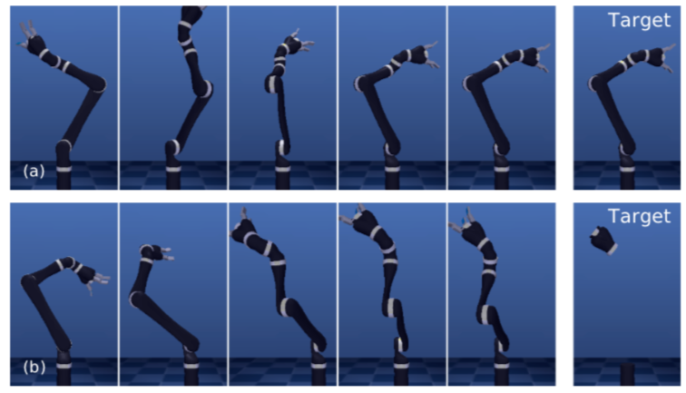 我们训练了一个 GN 向前模型,并将其用于MPC,通过梯度下降优化控制输入,在已知的奖励函数下使预测的报酬最大化。我们发现基于 GN 的 MPC 可以支持我们所有控制系统的规划,包括一系列奖励功能。图10显示了在 20 步规划地平线下,分别与目标姿势和目标手掌位置匹配的模拟 JACO 轨迹帧。