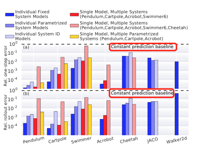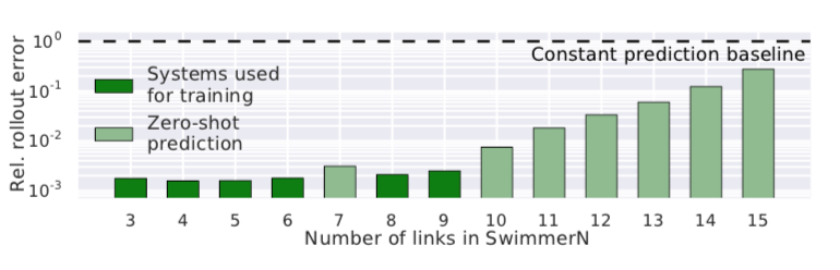我们通过在多个具有完全不同结构的系统上训练一个单独的 GN 模型来进一步推动这一点,并发现了类似的积极结果(参见图2,红色和黄色条)。这突出了 GN 和 MLP 模型在一般适用性方面的一个关键区别,GN可以自然地操作可变结构的输入,而 MLP 需要固定大小的输入。