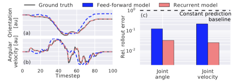 为了评估我们的方法在现实世界的适用性,我们训练了基于 GN 的前向模型,这些模型是在执行叠加任务的人工控制下,基于真实 JACO 本体感觉的数据。我们发现前馈 GN 性能不如递归 GN 预测模型准确。上图显示了来自测试集的代表性预测轨迹以及总体性能。这些结果表明,基于 GN 的前向模型是一种很有前途的模型学习方法。