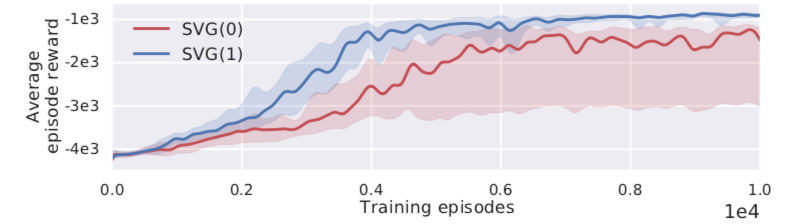 在第二种基于模型的控制方法中,我们使用 SVG 联合训练了 GN 模型和策略函数(Heess等人,2015),其中模型用于将误差梯度反向传播到策略,以优化其参数。关键的是,我们的 SVG 代理不使用预先训练的模型,而是同时训练模型和策略。与无模型代理(SVG(0))相比,我们基于 GN 的 SVG 代理(SVG(1))在较少的事件后实现了更高级别的性能(上图)。但是,对于具有多个前向步骤(SVG(2-4)),基于 GN 的代理的性能并没有显著提高,在某些情况下甚至更差(SVG(5+)。