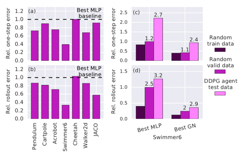 以上图 (a)-(b)表明,在我们测试的 7 个模拟控制系统中,有 6 个系统的 GN 模型的误差低于基于 MLP 的模型。对于具有大量重复结构的系统,如 Swimmer,这一点尤为明显;而对于具有很少重复结构的系统,如摆锤,GN 和 MLP 基线之间的差异可以忽略不计。这些结果表明,基于 GN 的预测模型对于学习各种复杂物理系统的预测动力学非常有效。