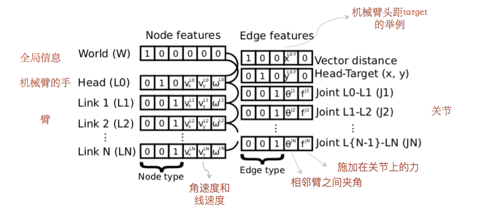 图3代表在物理系统中,我们可以用一个 Graph(global feature(g),node feature(n), edge feature(e) )来对他建模,把臂表示成节点,把关节表示成连边,分别用具体数据可如下: