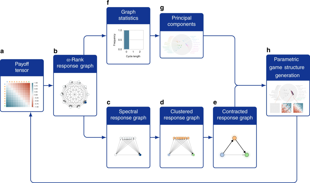 构建不同游戏策略空间的步骤如图所示。首先是根据α-Rank算法,将收益矩阵拆分为不同策略间的转移概率。之后将该图的特征值映射到拉普拉斯空间,通过频域分析,将相似的策略聚类。再构建出高层次的策略转移图(从c到e),而将图中的统计量进行主成分分析(从f到g)。