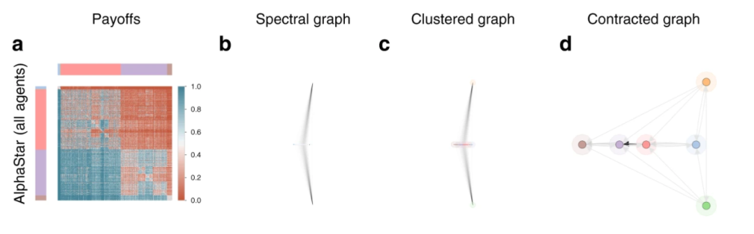 在对星际争霸这样涉及三个种族的对战类游戏的分析中,使用AlphaStar的不同版本(对应不同能力级别的策略),可以构建出游戏的策略空间,如图5所示。可以看到图5-d中,不存在一个最优的策略。是循环型游戏。