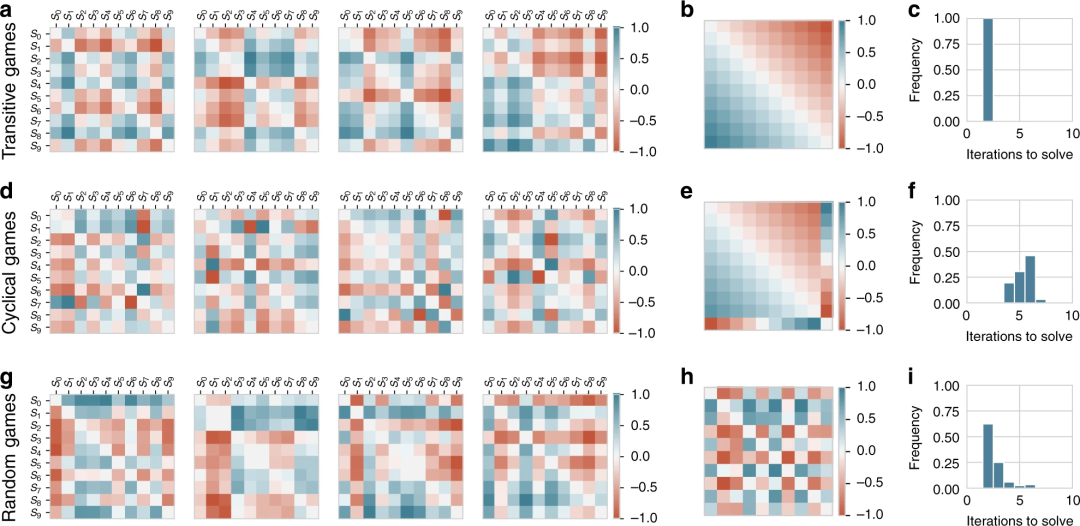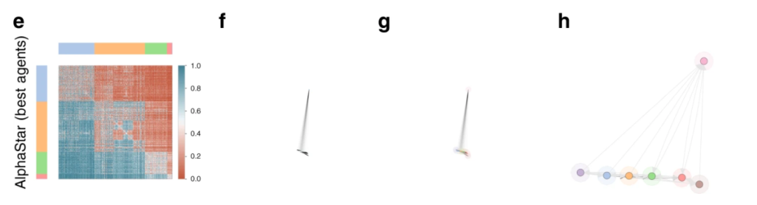 而只使用最强的数个AlphaStar智能体,构建策略的收益矩阵,经过相同的分析步骤,却可以得出截然不同的结论。如图6-h所示,存在一个比其他策略都好的最优策略。这意味着对很强的AI来说,星际争霸是可传导型游戏。强者之间博弈,反而更容易找到最强的。