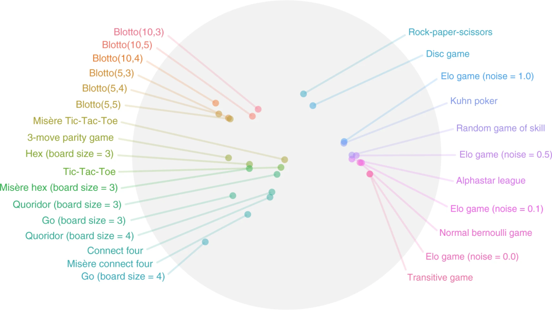 研究者将不同游戏置于同一策略空间,如图所示,其中位置相近的游戏,尽管其规则不同,但其在策略空间上的相近意味着游戏玩家所需的策略相似。