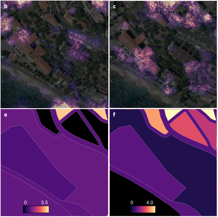 如上图 b-c 所示,算法识别出的贫穷和富裕地区均以热力图的形式进行了着色。进而,我们就可以得知是城市中的哪些几何结构表示了贫穷或富有的区域(e-f)。
