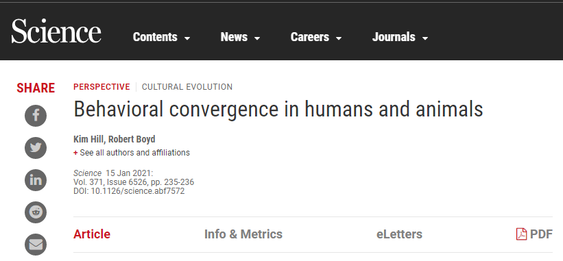 论文题目:Behavioral convergence in humans and animals论文地址:http://science.sciencemag.org/content/371/6526/235