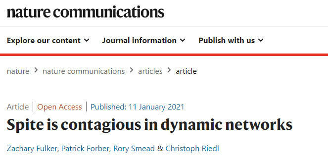 期刊来源:Nature Communications论文题目:Spite is contagious in dynamic networks论文地址:https://www.nature.com/articles/s41467-020-20436-1