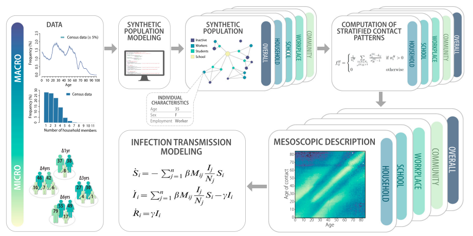 建模人口接触模型和流行病传播动力学的工作流程示意图