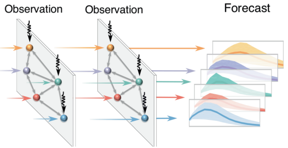 网络预测模型示意图。使用来自三个位置的(黑色箭头)数据来调整五个节点组成的动力学。并将调整后的模型向前发展来到下一个观测时间点,并最终发展到未来以实现对病毒传播的预测。
