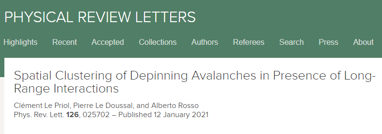 期刊来源:Physical Review Letters论文题目:Spatial Clustering of Depinning Avalanches in Presence of Long-Range Interactions论文地址:http://journals.aps.org/prl/abstract/10.1103/PhysRevLett.126.025702