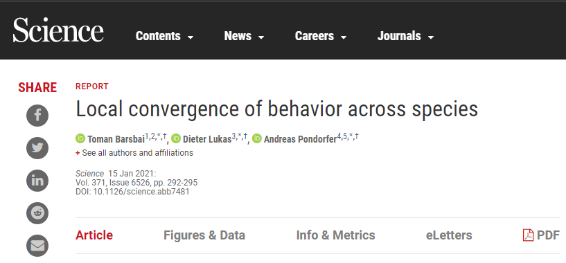 期刊来源:Science论文题目:Local convergence of behavior across species论文地址:https://science.sciencemag.org/content/371/6526/292