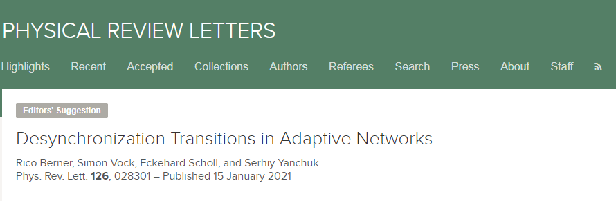 期刊来源:Physical Review Letters论文题目:Desynchronization Transitions in Adaptive Networks论文地址:https://journals.aps.org/prl/abstract/10.1103/PhysRevLett.126.028301