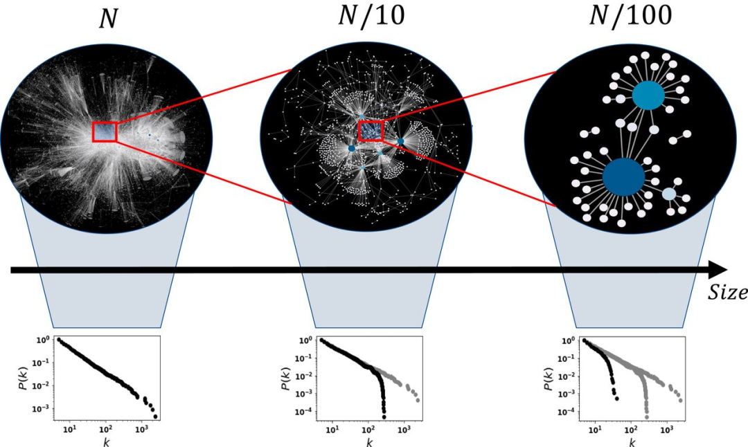 网络中潜在的幂律行为被样本大小模糊的示例。左图为节点数为N的完整网络,中图为网络规模为N/10的子网络,右图为网络规模为N/100的子网络。随着网络规模的减小,幂律行为愈发不明显。