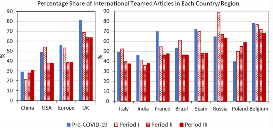 图 | 受影响最严重的国家和地区在不同 COVID-19 时期,其国际合作文章在所有文章中所占的百分比。