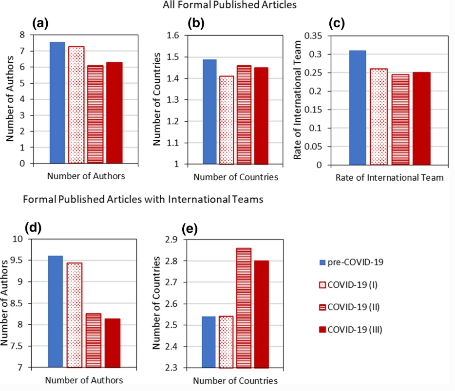 图 | (a,b)所有正式出版物的平均作者和国家 / 地区数量;(c)所有正式出版物中国际化文章的比率;(d,e)国际合作正式出版物中作者和国家 / 地区的平均人数