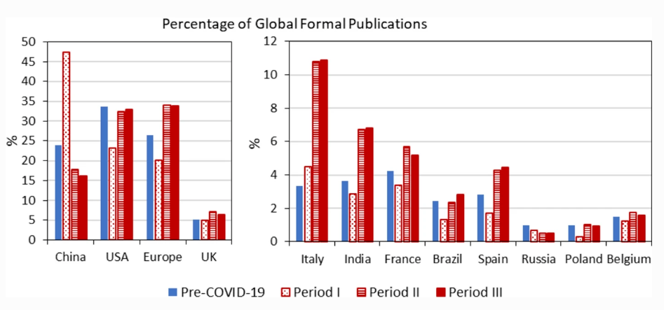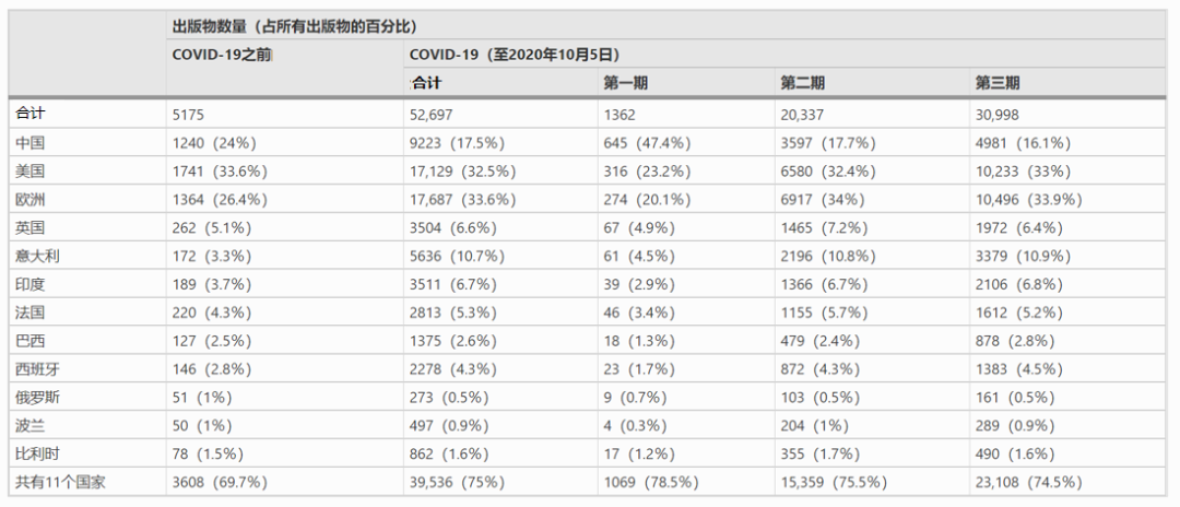 图 | 各国在大流行的三个不同时期发表的科研论文数量及全球占比
