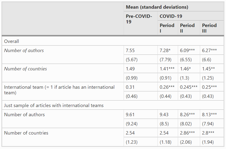 然而,在此次的研究中,他们却发现在 COVID-19 期间的冠状病毒研究中,这一规律似乎被逆转了 —— 原本冠状病毒研究项目的团队规模正在持续缩小。如下图中所示,无论是出版物的平均作者数量还是国家地区数量,从大流行前期到第三时期,都有所下降。