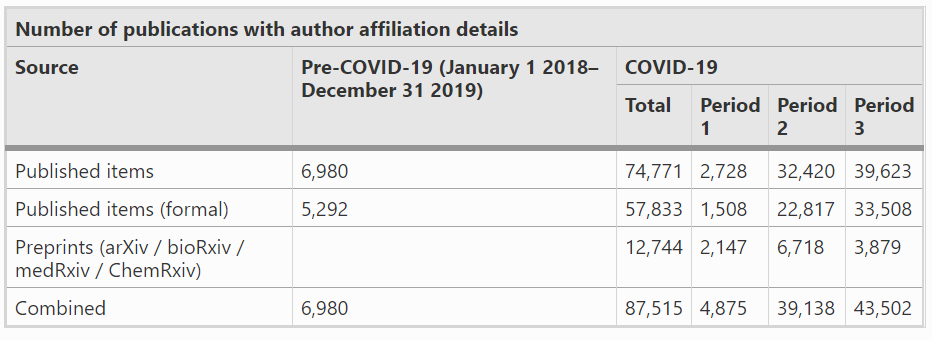 研究人员在几个科学数据库中(包括 Elsevier Scopus、Clarivate Web of Science、PubMed Central 及各类预印本网站)搜索了与冠状病毒相关的文章,发现从 2020 年 1 月至 4 月中旬,与冠状病毒相关的文章有 4875 篇,到了 7 月中旬,这一数字直接上升到 44013,到 10 月初则几乎翻倍,增长到 87515 篇。