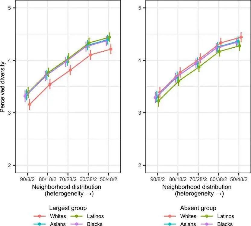 “多样性”(diversity)一词虽然应用广泛,但却蕴含深意。一方面,多样性可以指异质性(heterogeneity),仅取决于一个地区中群体的数量和相对规模,而不取决于它们的身份。另一方面,多样性也可以指代表性(representation),即一个地区中特定的少数群体存在,比如在美国的亚裔、黑人等。 近日发表在 Science Advances 上的一篇文章通过种族平衡的全国范围样本联合实验来揭示美国人可能使用哪些属性、异质性或少数族裔代表来评估生活社区的种族多样性程度,以及该评估是否因参与者的种族而不同。结果表明,感知得到的多样性与异质性密切相关。相对于黑人、拉丁裔、亚裔,这种联系在白人身上更为强烈。此外,黑人、拉丁裔和亚裔认为自己族群所处的社区更加多元化。另外,白人将多样性与代表性联系在一起的程度各不相同,在和多样性相关的政策问题上持保守立场的白人认为,以白人为主的社区比以黑人为主的社区会更具多样性。人们可以认可多样性是向好的趋向,但不认可到底是什么让一个社区变得多样化。