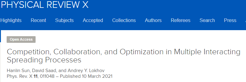 论文标题:Competition, Collaboration, and Optimization in Multiple Interacting Spreading Processes论文地址:https://journals.aps.org/prx/abstract/10.1103/PhysRevX.11.011048