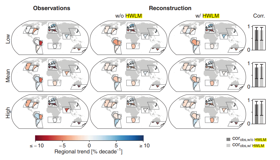 探究人为气候变化(anthropogenic climate change,ACC)后果的关键参数之一是气候变化对陆地水循环的影响。地球系统模型(earth system models,ESM)表明,预计的ACC可能会影响陆地的水供应并可能引发更多的洪水或干旱。研究人员检测并进行归因分析,结果表明,观测到的大气变量(例如降水、水蒸气等)的变化与解释历史ACC的模型模拟保持一致,但全球范围内,人类历史记录仍然缺乏河流流量和水文极端现象的数据。 研究人员发现,在观测到的低流量、平均流量和高流量的趋势模式中,可以检测到历史辐射强迫(historical radiative forcing)和历史水土管理(historical water and land management,HWLM)的组合效应。分析还表明,在历史辐射强迫下,模拟趋势模式的幅度与观测值一致。结合考虑到HWLM不能提升重建的效果,这意味着HWLM的模拟影响仅对区域中位数河流量趋势产生较小的影响。因此,结果表明,历史辐射强迫对气候系统的模拟影响对于解释观测到的区域中,低、中、高河流流量的模式至关重要。