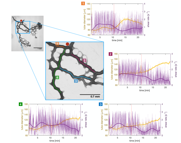 受控于化学物质而非流速的管道扩张。网络中管道的直径发生的变化(黄色曲线),并不是由流动剪切速率的变化(紫色曲线)引起的。