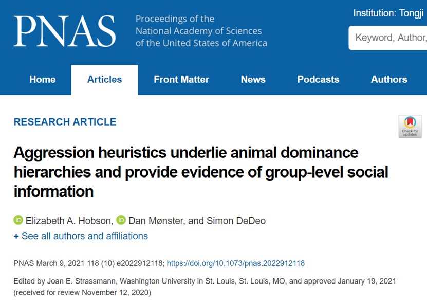 论文标题:Aggression heuristics underlie animal dominance hierarchies and provide evidence of group-level social information论文地址: