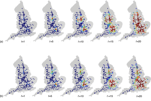英格兰道路网络上的高传染性耦合过程的协同传播。两种过程的起点分别为大伦敦(Greater London)和利兹(Leeds)。