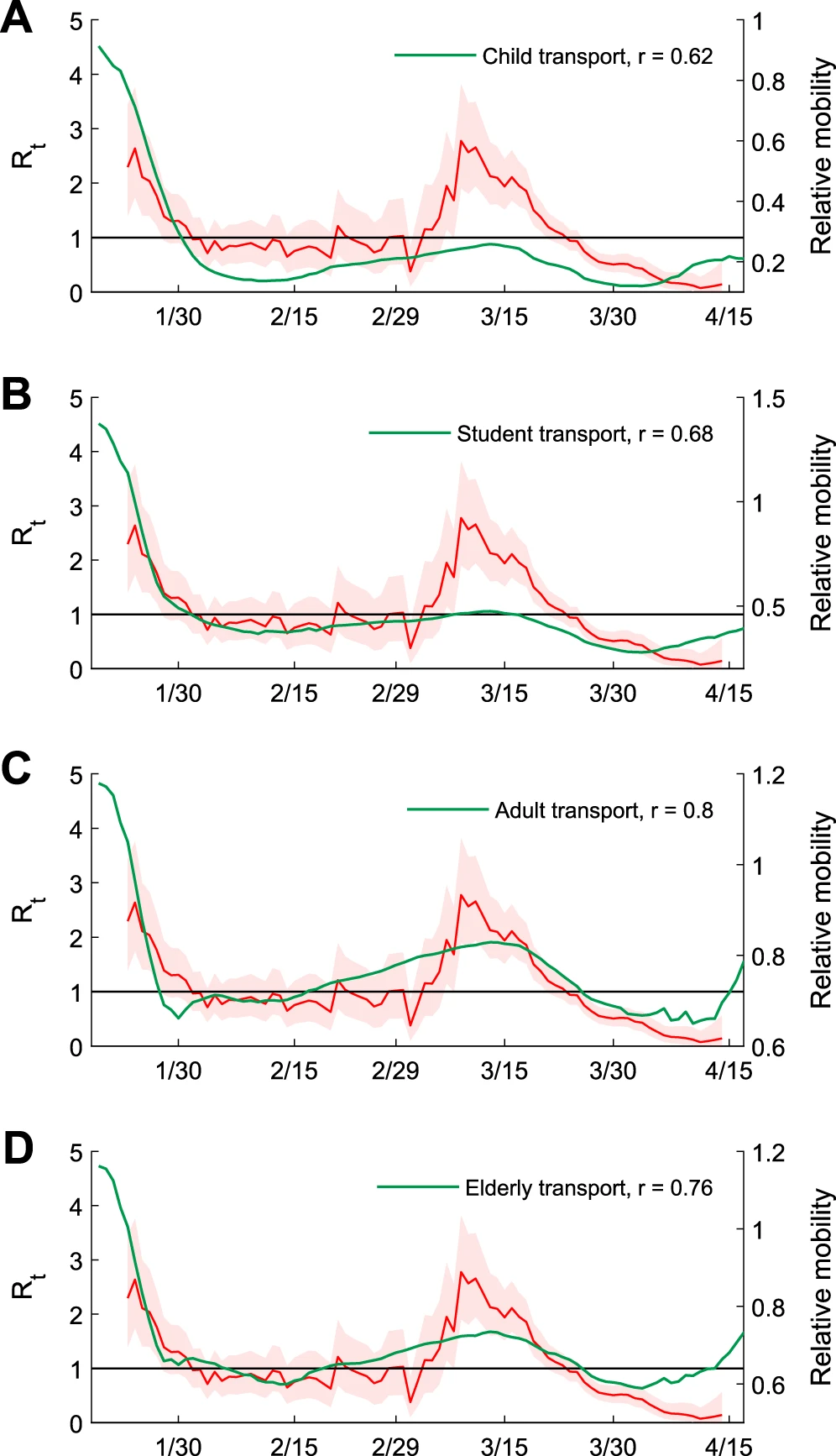 根据香港八达通运输数据推断的COVID-19的传播与人口流动之间的相关性。图A–D分别针对儿童、学生、成人,以及老人。