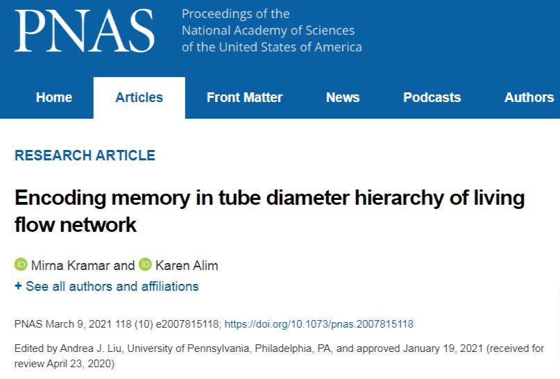 论文题目:Encoding memory in tube diameter hierarchy of living flow network论文地址:https://www.pnas.org/content/118/10/e2007815118