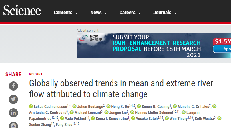 原文标题:Globally observed trends in mean and extreme river flow attributed to climate change原文地址:https://science.sciencemag.org/content/371/6534/1159