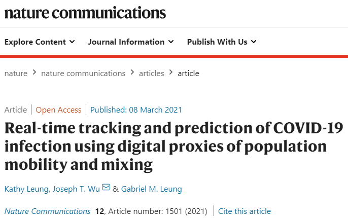 论文标题:Real-time tracking and prediction of COVID-19 infection using digital proxies of population mobility and mixing论文地址:https://www.nature.com/articles/s41467-021-21776-2