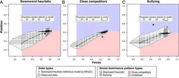 上图表示每个社会群体都是根据它们所遵循的阶级导向的社会支配模式来分类的。分别是(A)向下启发式(骡鹿),(B)紧密的竞争对手(和尚鹦鹉),(C)恃强凌弱(长尾猴)。